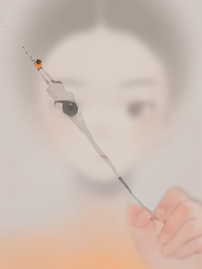 一見、静かな絵に見えますが、曇りガラスの透けた向こうに除く瞳が魅力的で、境界の向こうから視線に強さも感じます。透けた部分も実は主人公の影だったり、その影をまた主人公がつまむような仕草をしていたり、イラストレーションの中の重層的な構造が鑑賞者の想像力を膨らませてくれます。曇りガラスでぼやけた、手や表情も実はしっかり描かれていて実力を感じました。