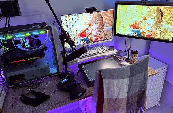 自作PC(CPU:Intel Core i7-17000K/RAM:64GB/GPU:NVIDIA GeForce RTX3070)に、Wacom Cintiq Pro 16を繋いで使っています。ディスプレイはPixio 248 Wave/WhiteとAcer SigmaLine KG241の2枚ありますが基本的に作画作業はWacom Cintiq Pro 16で完結しています。サブデバイスはLogicool G13をずっと愛用していて、ツールはCLIP STUDIO PAINTをメインに、仕上げのフィルター処理や納品時の調整にAdobe Photoshopを使うことがあります。