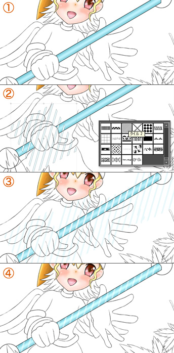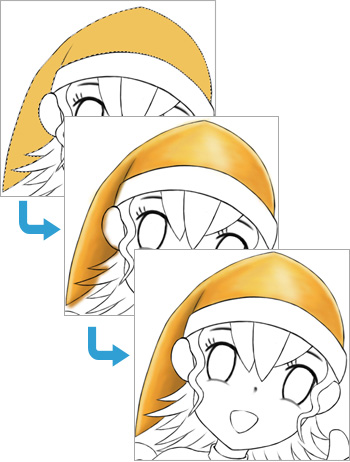 キャラクターと同様に、自動選択ツールで範囲を指定して、ベースカラーで塗りつぶし→レイヤーを重ねて陰影を付ける→クリッピングマスク作成ではみだし部分をカット→ハイライト等の処理。という流れで行います。