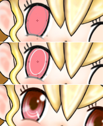 中央の瞳やハイライトを入れたら、ベースカラーの上方に暗い色で影をつけて、上から下へのグラデーションになるようにし、目のレイヤーを結合します。