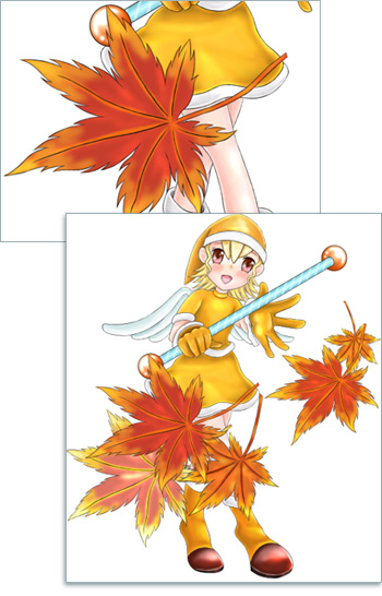 キャラクターと同じ工程で、前面の紅葉を一枚ずつ描いていきます。