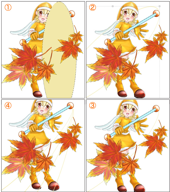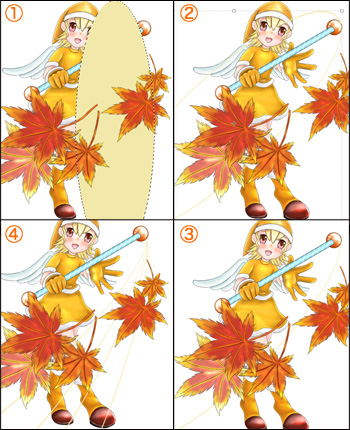 - [楕円形選択ツール]で右寄りに縦長に範囲選択し、キャラと紅葉の間に新規レイヤーを作成して、薄い黄色で塗りつぶします。
