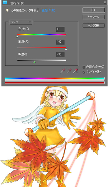 さらに[画質調整]→[カラー]→[色彩・彩度]で色彩の統一にチェックを入れてから、色を赤寄りに調整して、光線が赤く光っている効果を作ります。