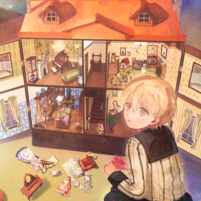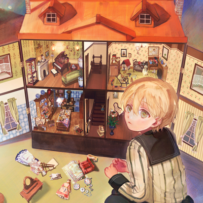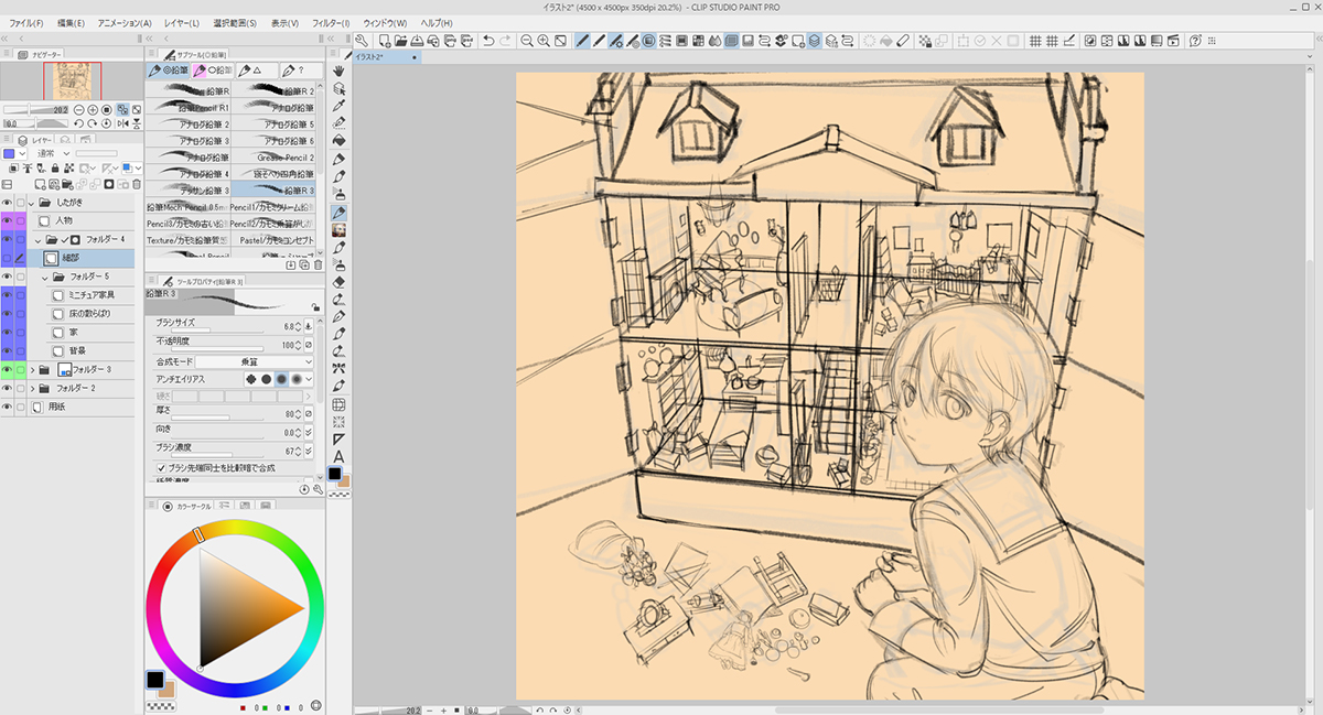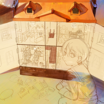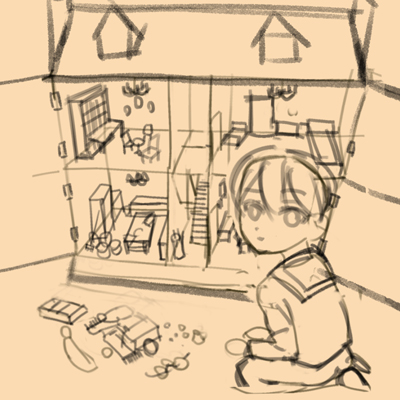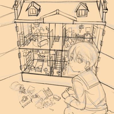 CLIP STUDIO PAINTに作業を移し、大ラフを元に改めてラフを描いていきます。大まかなドールハウスの形や人物の形も取ります。