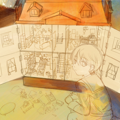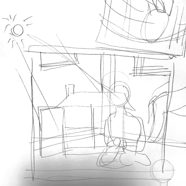 今回描くのはドールハウスで遊んでいる男の子の絵です。まずはアナログで大まかなイメージを描くのですが、この段階で光源を決めておきます。