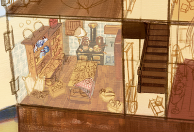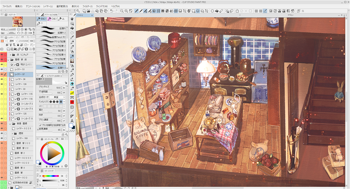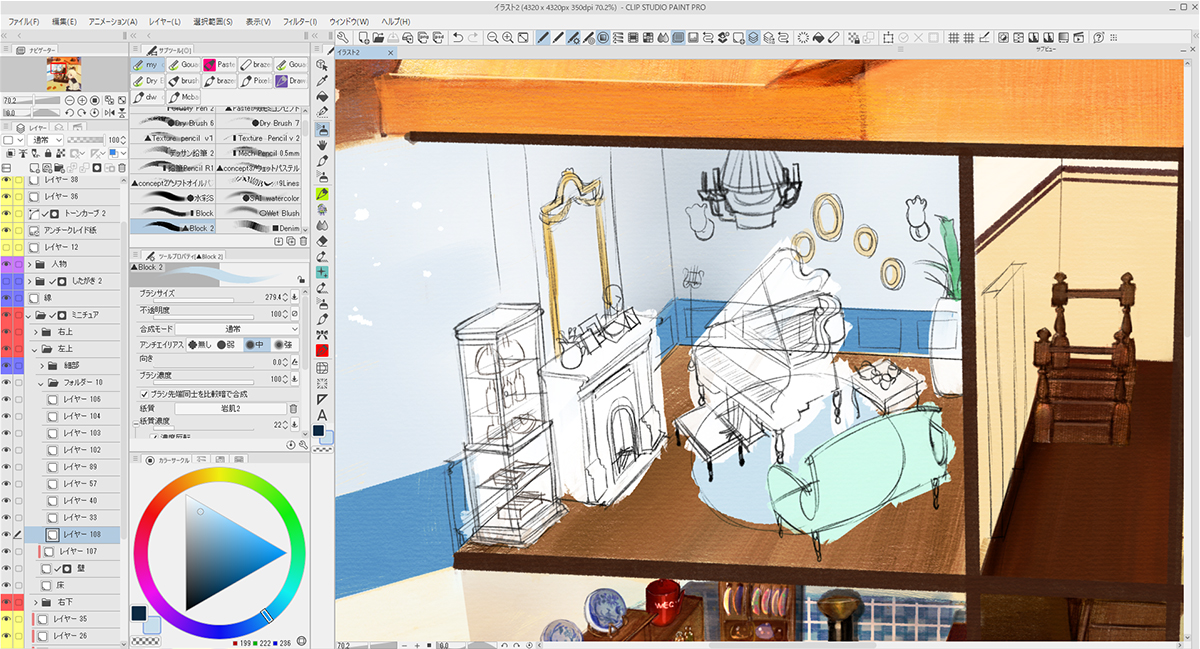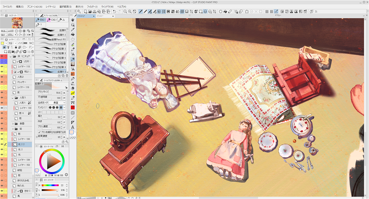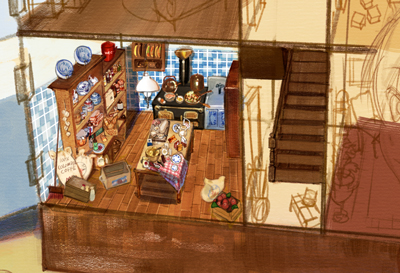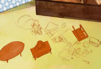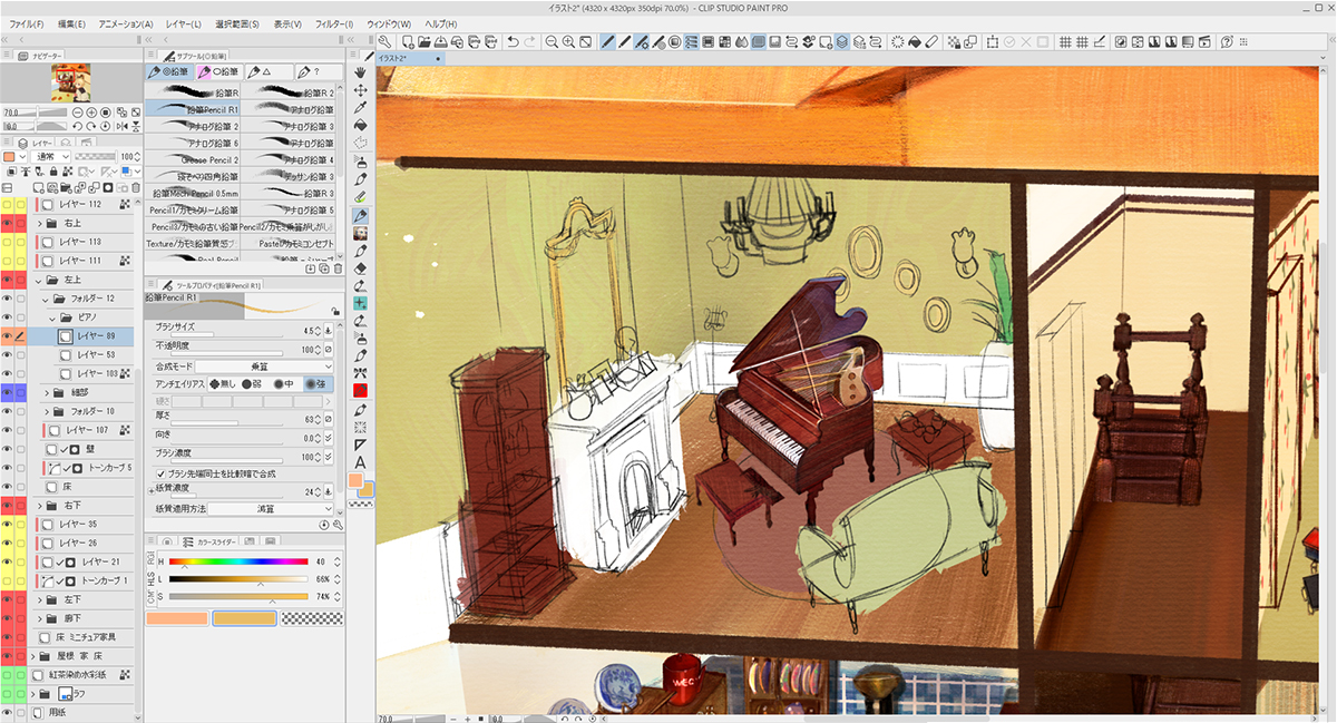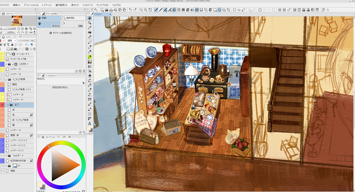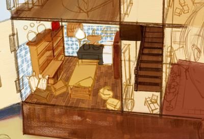 家の外装や家具のアタリを描いた下描きのレイヤーを薄く敷きながら、新規レイヤー上に家具や小物を配置していきます。