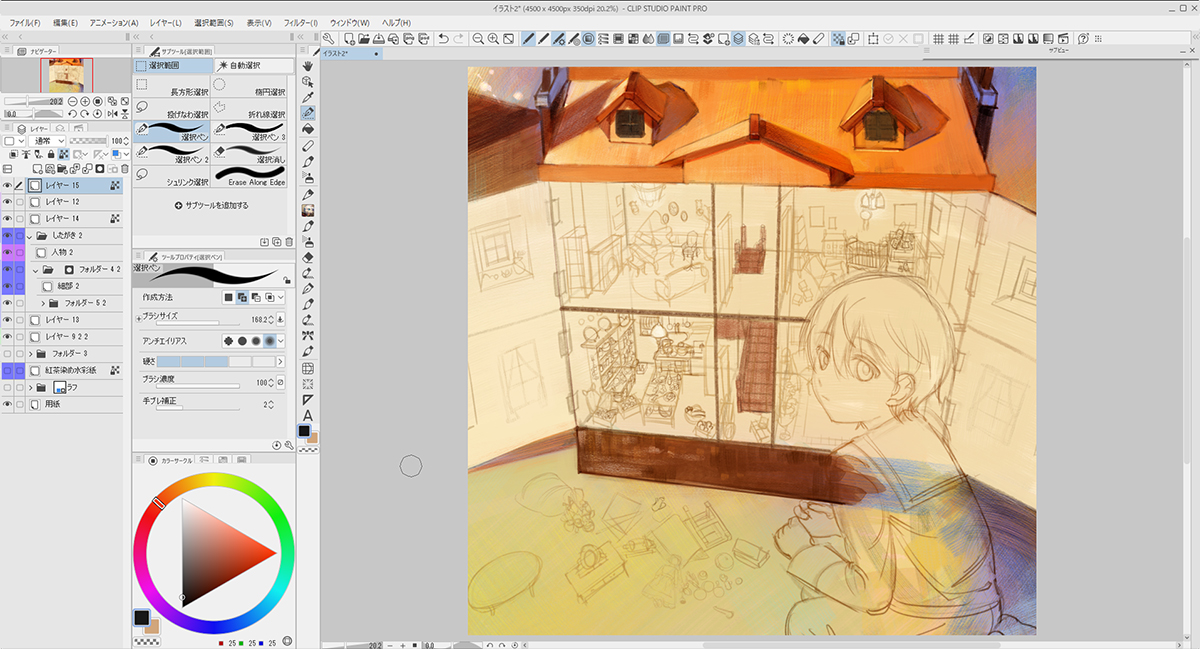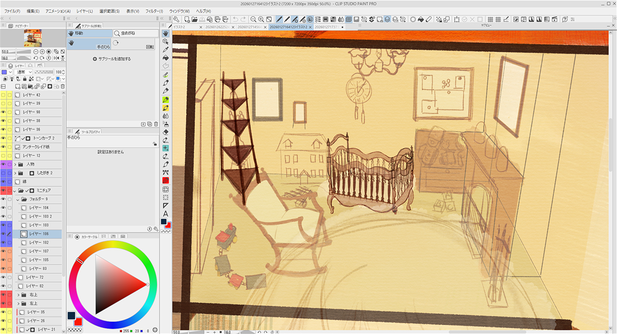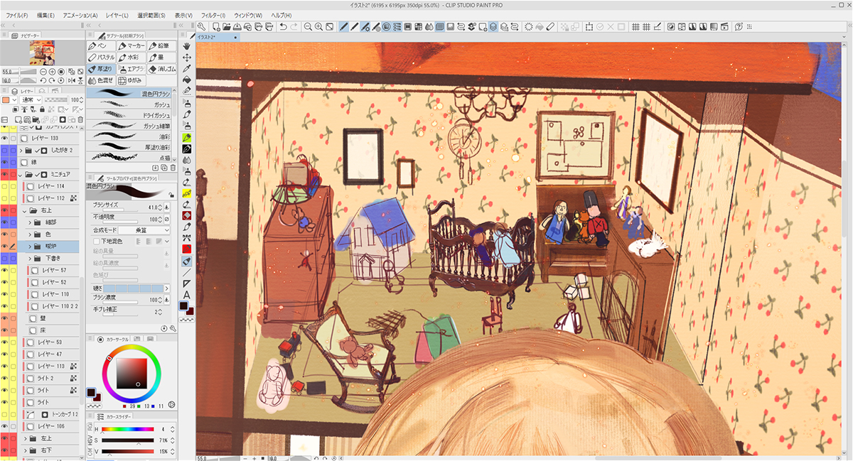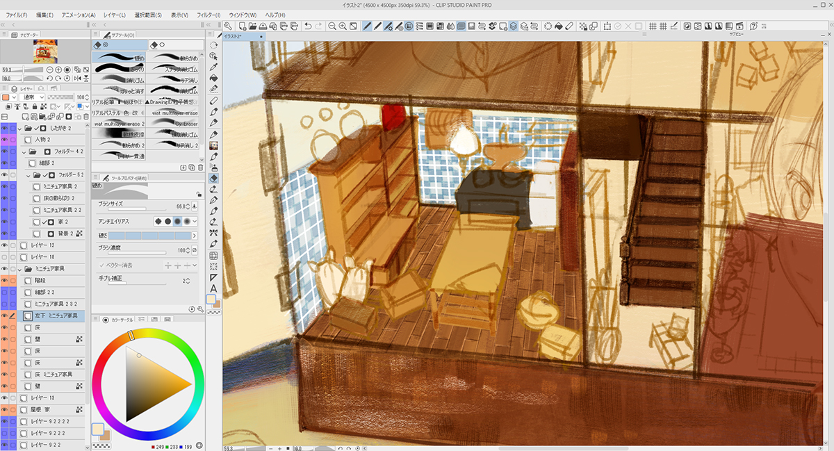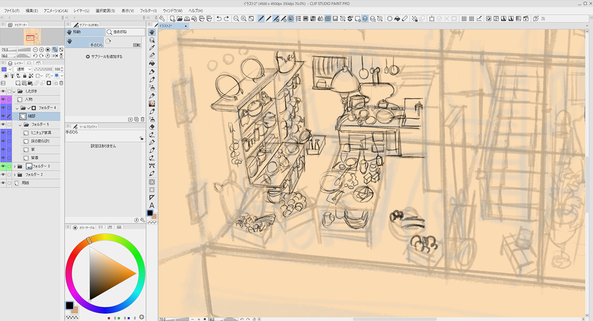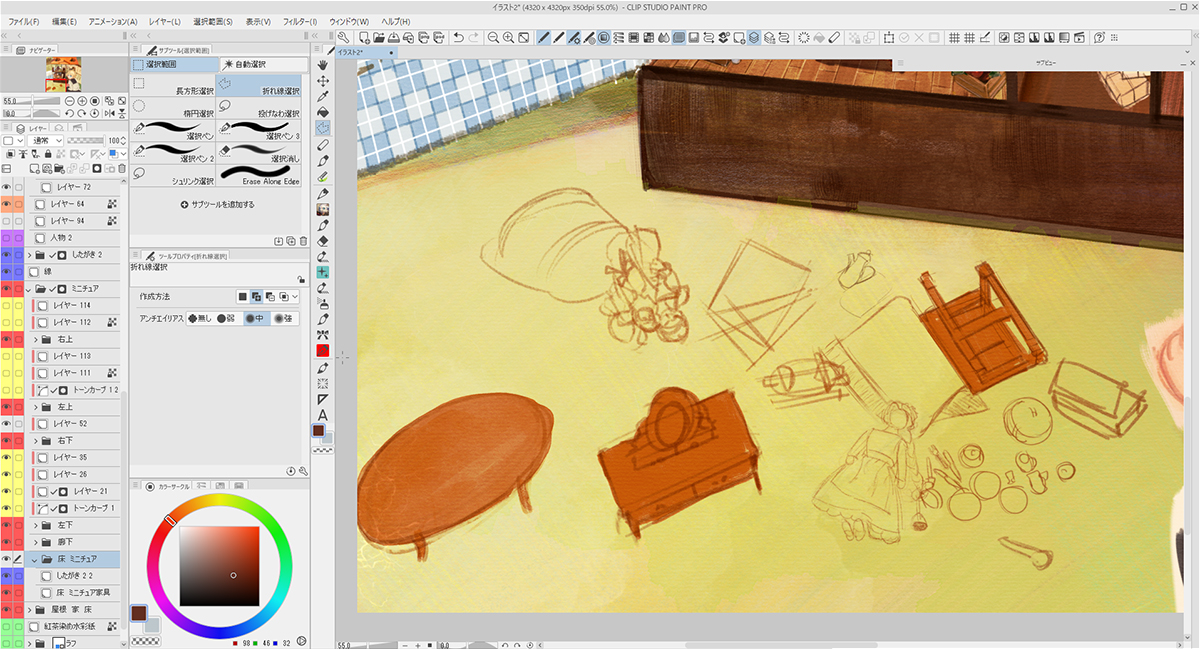 描き込むにあたり、「背景」「家」「ミニチュア家具」「人物」とレイヤーフォルダーを作って分けました。