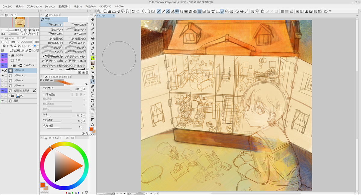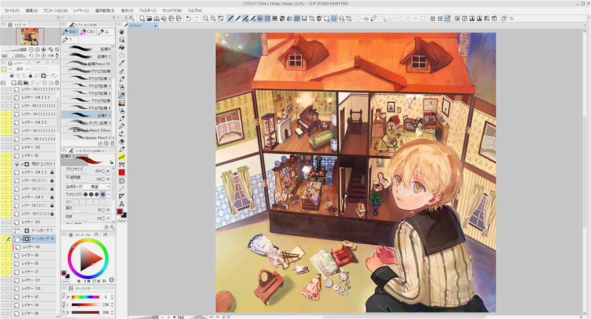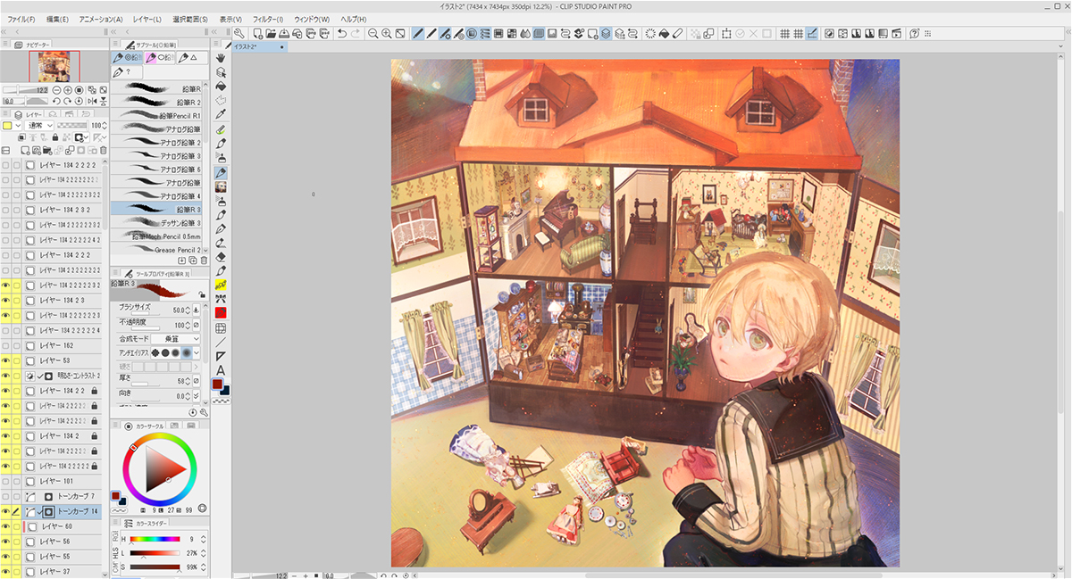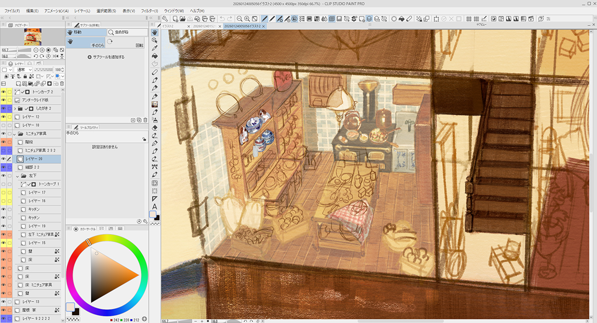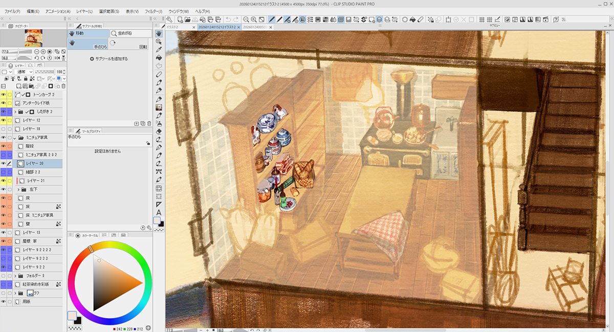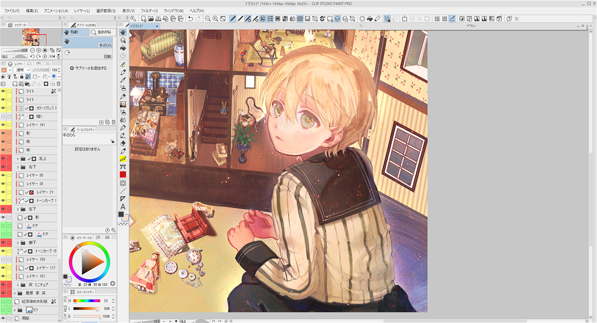 描き込むにあたり、「背景」「家」「ミニチュア家具」「人物」とレイヤーフォルダーを作って分けました。