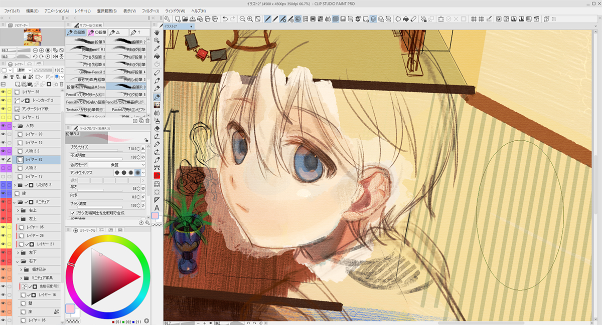 CLIP STUDIO PAINT PROを使った、ブラシのタッチを残しつつ細やかに仕上げる作画の工程を紹介します。