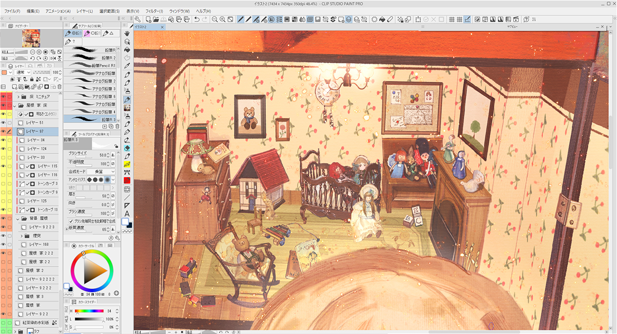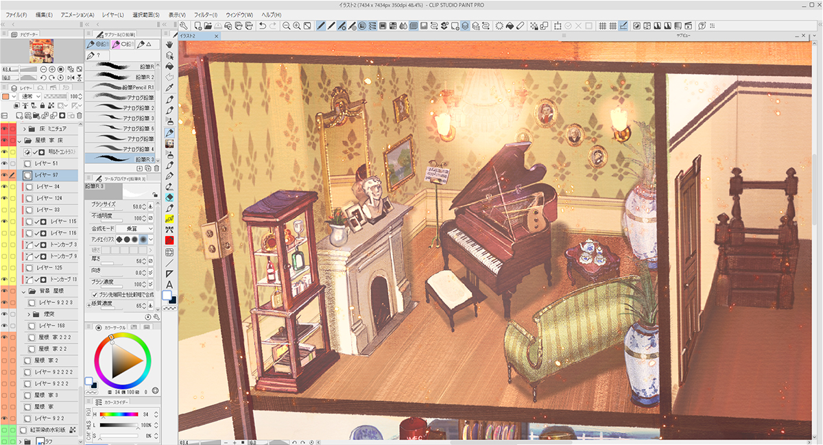 壁や床、家具を塗り終えたらレイヤーの不透明度を薄くして、下描きを表示させました。