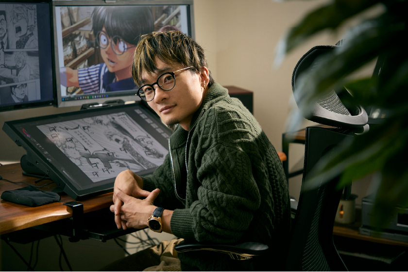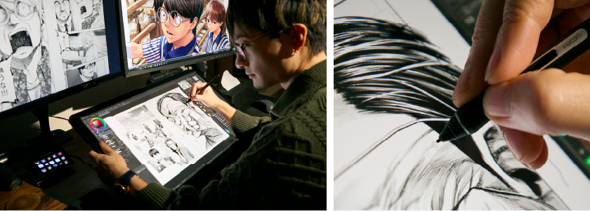 もうひとつ、丸山氏が強く信頼を寄せているのが、Wacom MovinkPad Pro 14です。海外取材や全国各地での講演を行っている丸山氏は、飛行機や電車の中での作業がかなり効率的になったといいます。「ペンのサイドスイッチを使えるのがいちばんですね。スポイトツールを使うときなど、タップで操作するよりも、ボタンを押しながらスッと動かせる方が圧倒的にストレスが少ないです。それと、ペンの充電がいらないというのも大きなポイントですね」。現在では、出先でネームから下書き、場合によってはペン入れまで完了させることもあるそうです。