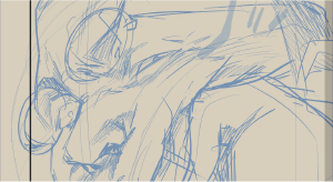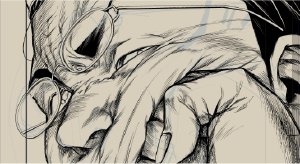 下書きの上から、Gペンを使って、本番となる線(主線)を描く段階です。線の強弱やタッチで、キャラクターの感情や背景の空気感を表現します。