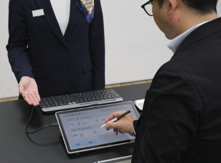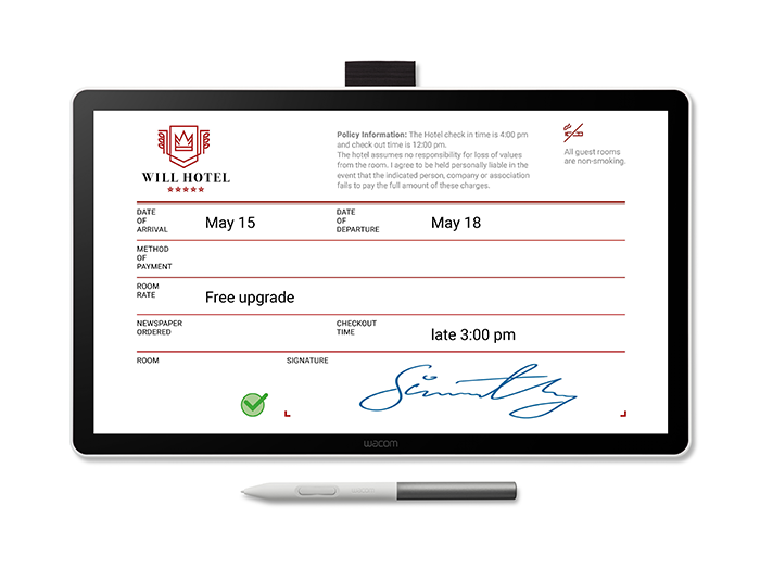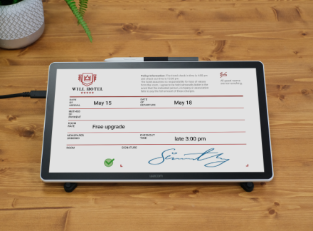 「Wacom One 液晶ペンタブレット」は、自治体の窓口や、ホテル、金融機関、工場などの受付業務のペーパーレス化に最適な入力デバイスです。お使いのPCにつなぐだけですぐに使うことができ、帳票入力や手書きサインなど画面に直接行うことができます。保険や金融商品の申込書や契約書へのサインを伴う対面接客業務にも利用されています。薄くコンパクトで窓口やデスクに設置しやすく、直感的な操作性でさまざまな手書き業務のペーパーレス化を実現します。