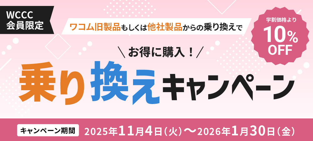 ワコムクリエイターズカレッジクラブ(WCCC)加盟校に所属の学生・教職員の方で、ワコムのペンタブレットまたは他社のペンタブレット製品をお持ちの方を対象に、WCCC特別販売サイトで販売している製品をさらに10%OFFでご購入いただけるキャンペーンを開催しています。